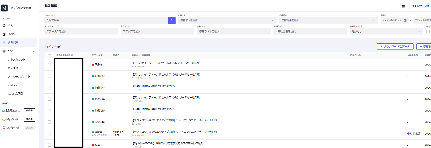 各プロダクト経由でご応募いただいた候補者様は、自動でこちらの画面に登録され、お名前をクリックすると詳細画面が立ち上がります。
