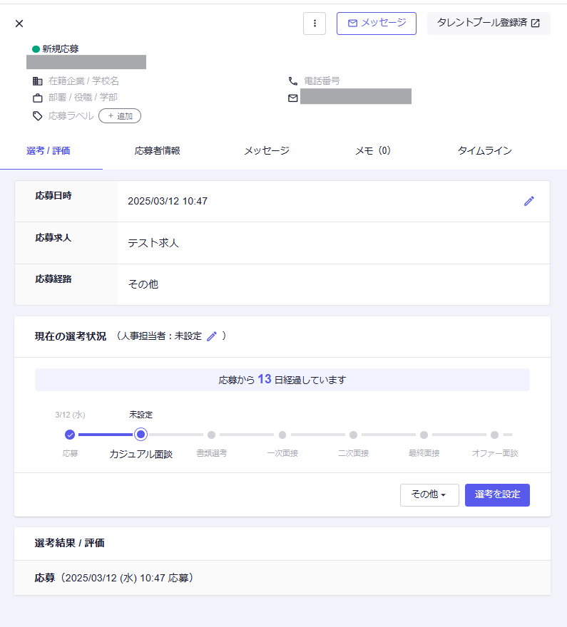 応募者情報に対し行った操作がタイムラインで表示されます。
