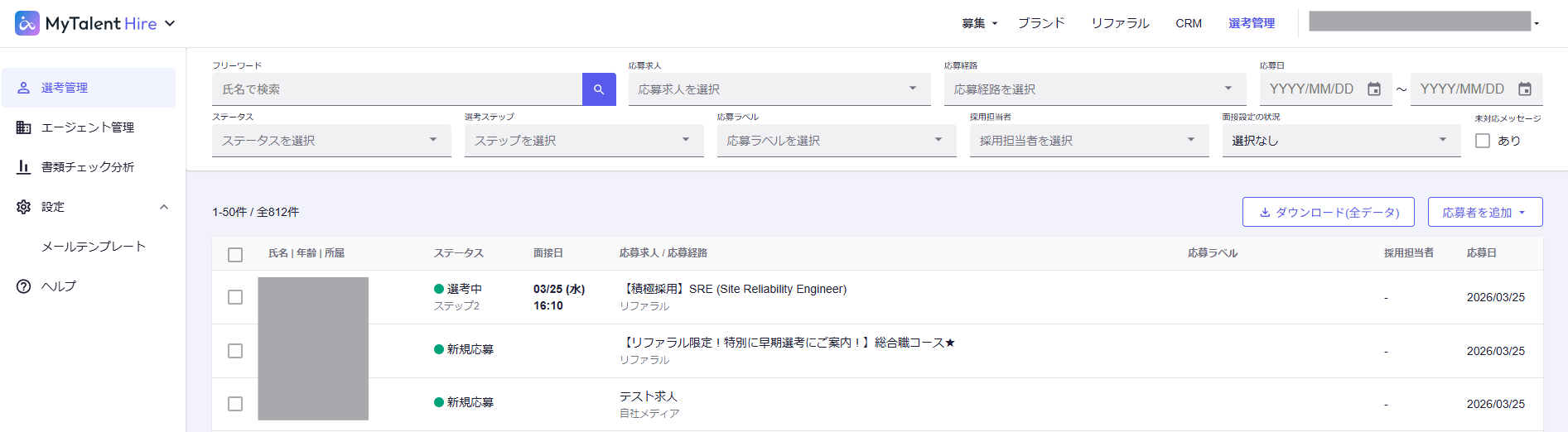 本記事では、MyTalent Hireの選考管理でできることを紹介します。 「選考管理」機能では、M各サービス経由で応募した候補者の一元管理や、選考の進捗確認、候補者との直接的なコミュニケーションが可能です。