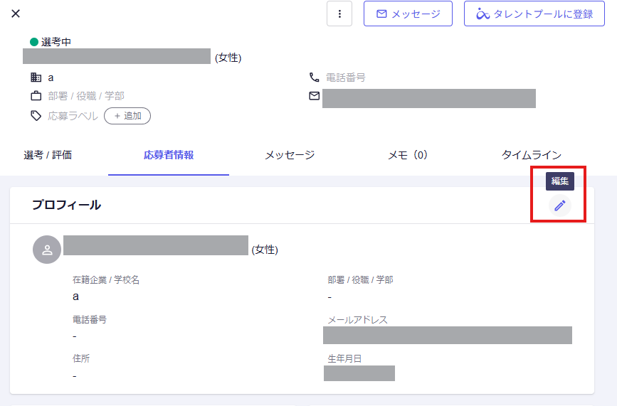 MyTalent Hire>選考管理>応募者詳細画面>応募者情報