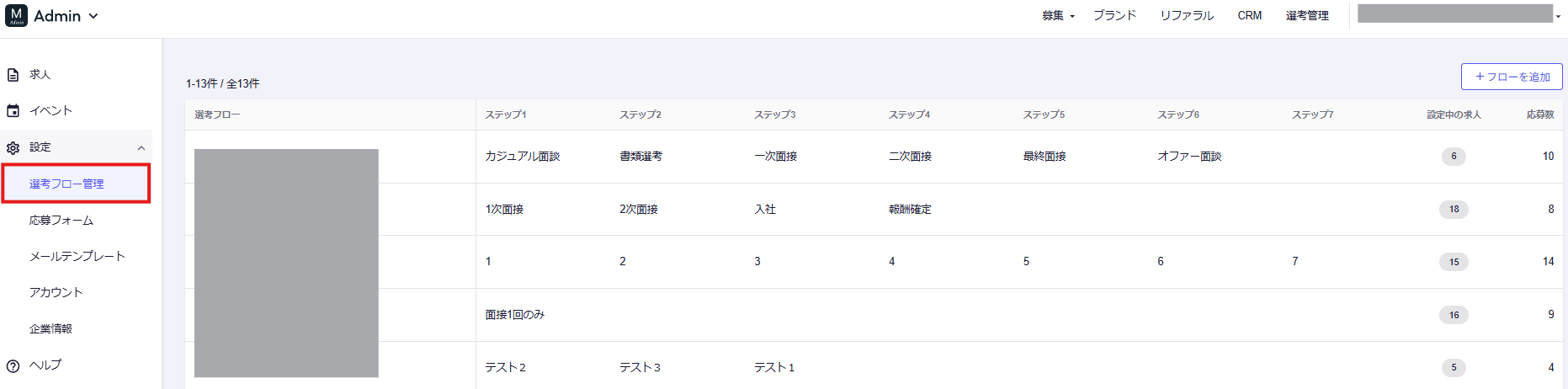 ①Admin>設定>選考フロー管理>複製したいフローを選択>縦三点リーダーを選択>「選考フローを複製」