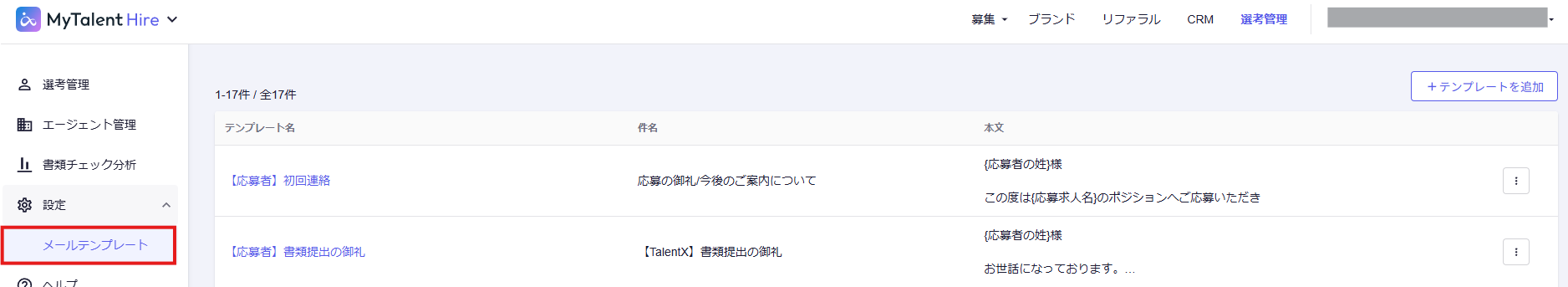 ※MyTalent CRMのテンプレート設定はこちらをご覧ください。